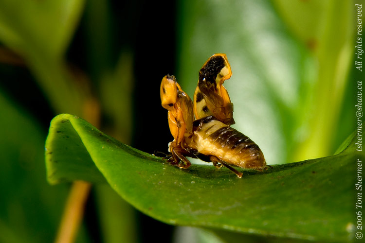 After a couple of minutes, I tired of waiting for him, supporting my bulky camera and lights in one hand. So I put the tyke back on the bush, making sure he got a good grip, before turning my attention back to a bigger fellow. |