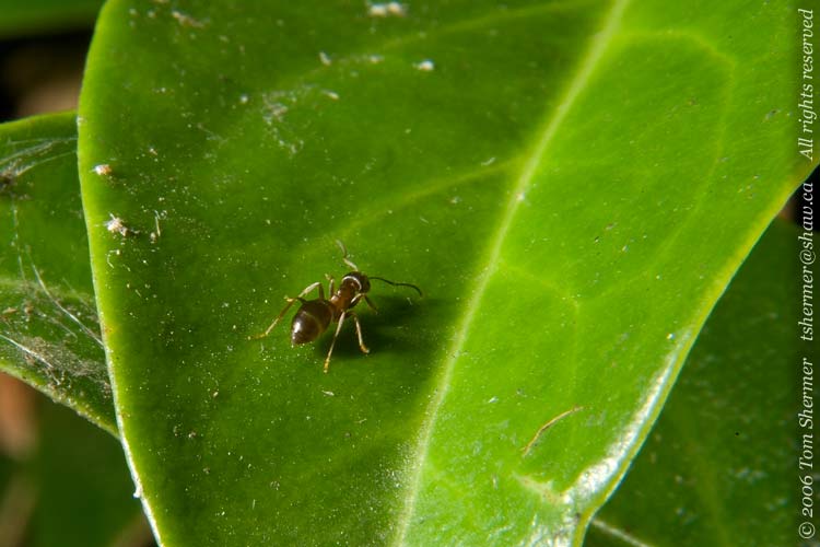 Being alert for small movements, I saw an ant scurry out to the end of a leaf, and was able to get focussed and to get a few shots of it before it made it back underneath other leaves to the stem. |
