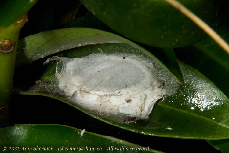 My next discovery on the bush was an interesting cocoon of some sort. It's got a circular interior, with thick walls and a thin covering layer. It seemed too big for anyone's pupa, and so it most probably holds a clutch of eggs. Someone who would know much better than I had a look at the photo and suggested that it's the work of a spider...and that the spider is probably in there, guarding the eggs. |
