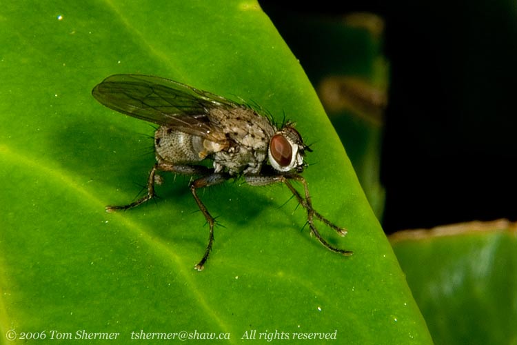 Speaking of which, here's another finely-formed fly, sporting a brown-and-grey body, dark legs, yellow feet, a white face, and rufous eyes. My consultants couldn't be sure on this one, but the best guess is that this here's a Tiger Fly, in the genus Coenosia. |