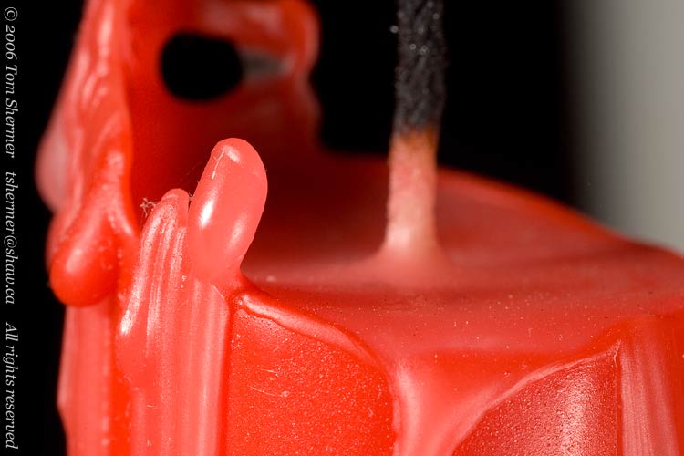 Although I had gotten a few good photos, I wasn't feeling particularly inspired by this indoor stuff. I looked around some, and, as is often the case when I'm not inspired, couldn't seem to find anything I wanted to shoot. After a few minutes, I settled on a candle. Just to keep it easy, I didn't light it. |