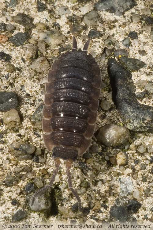 It was night out, and I was finding my subjects with the help of a little white l.e.d. light on the flash units for my camera. Aside from snails, the other things that I found a lot of in my l.e.d. beam were Sowbugs. Sowbugs are not insects (they've got too many legs for that) but are another type of arthropod, similar to the bugs I once knew as pillbugs or rolly-pollies. The sowbug that seems to be predominate around here is Porcellio scaber, which is easy to identify, as it has little bumps all over its shell, whereas other sowbugs don't. So this fellow is a P. scaber.