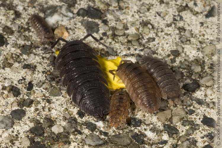 I took several shots of individual sowbugs before finding a little group of them gathered around a flower petal, nibbling on it, I presume. It was a nice little family dinner. |