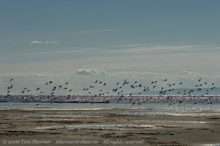 I hadn't seen any shorebirds on the mud on the way out toward the waterline, which seemed a little unusual. All of them were out by the water. Occasionally, a flock would fly past, going one way or the other. |