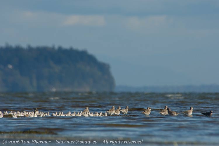 The large birds in this photo are Black-bellied Plovers, and the small birds are Sanderlings. There's also one Western Sandpiper visible—he's the really small brown guy over the 'o' and 'm' in "Tom".
