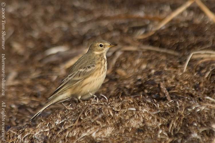I was a bit discouraged by this, as my plan wasn't going to work, and I wasn't seeing any birds near where I was. But I kept scanning as I walked along, and soon some motion in the dried plant matter caught my attention. It took some waiting and watching, but eventually the source of the motion moved again, and I saw that it was an American Pipit. I got down on one knee to take photos, even though there was a little standing water where I was. |