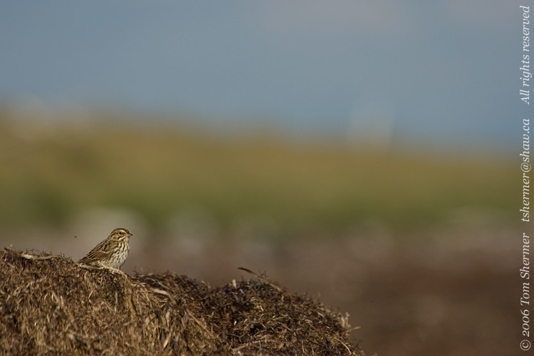 From my position, I saw a Savannah Sparrow come and land on a nearby clump of dirt and vegetation. That little dot to his left isn't from dust on my lens or camera sensor; that's an insect flying around. |