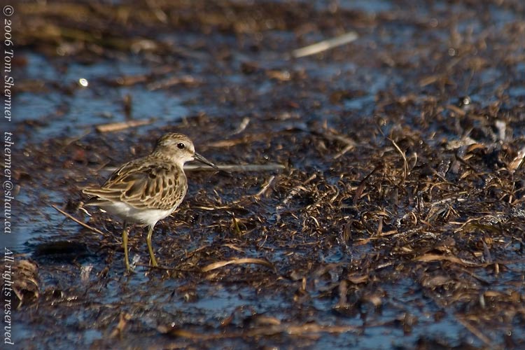 With no more nearby subjects, and the water now several centimeters deep, I got up and started walking my half-wet self towards my car. On the way, I found some more shorebirds up near the dyke. The first one was easy to identify: in these parts, any shorebird this small with yellow legs is a Least Sandpiper. |