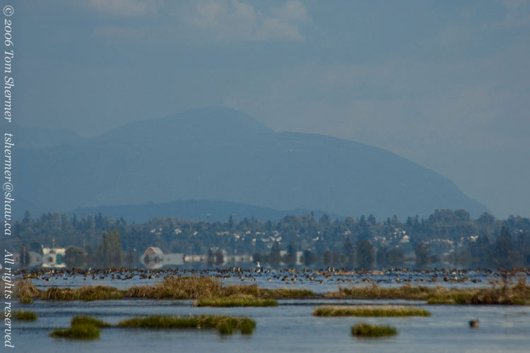 I reached the spot nearest my car, and I climbed over the logs and rocks to reach the dyke. From there, I took a few photos around the bay. This one shows the flock of ducks, much closer now, and from a higher angle. The ducks were dabbling ducks, who stick their head down in the water to pick at submerged edibles. I can recognize a few species there—Northern Pintail, American Wigeon, and Green-winged Teal—and there are probably others. |