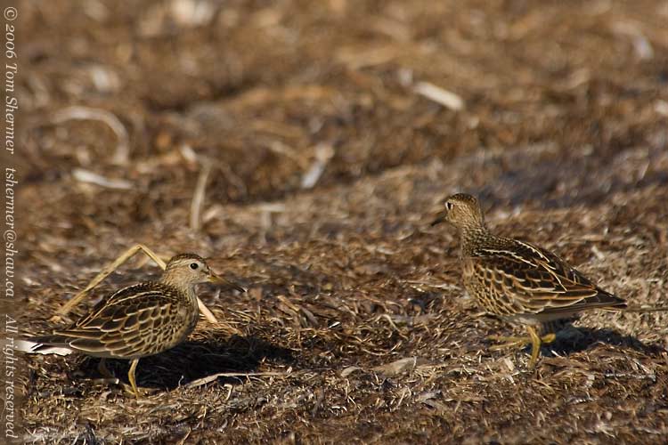 The next birds I found as I went along were these fellows. They're yellow-legged, but a fair bit bigger than the Least was. These guys are Pectoral Sandpipers. Despite their size, I didn't see them until I was almost upon them; their camoflauge is quite effective. |