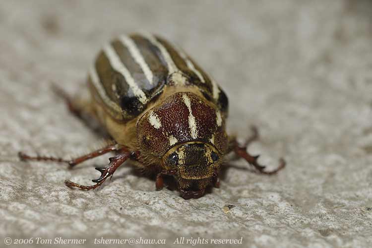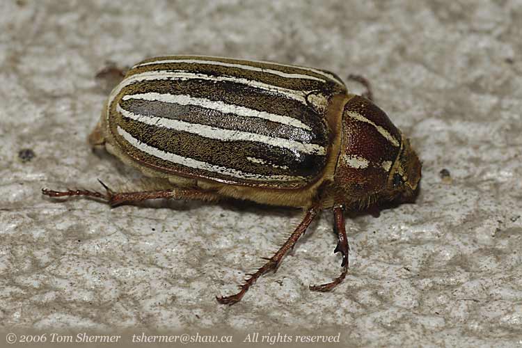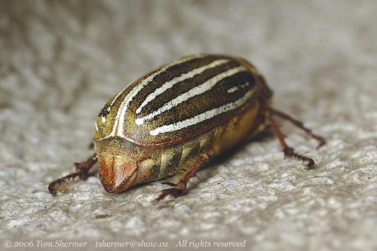 This beetle is the Ten-lined June Beetle, Polyphylla decemlineata, and it appears to be a female. This poor lady was either deceased or in a deep meditation, because she didn't move at all while I was photographing her. |