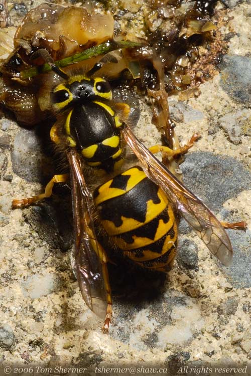 In contrast to that ugly, sloppy hornet above, here's a cute little Yellowjacket, politely nibbling on a squished berry. |