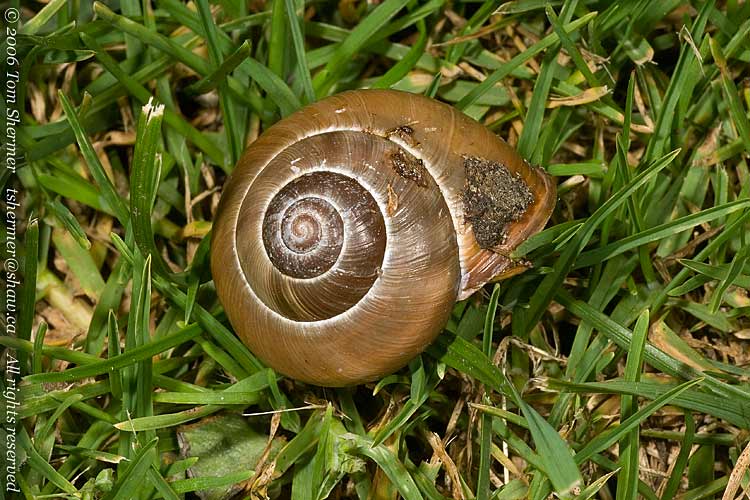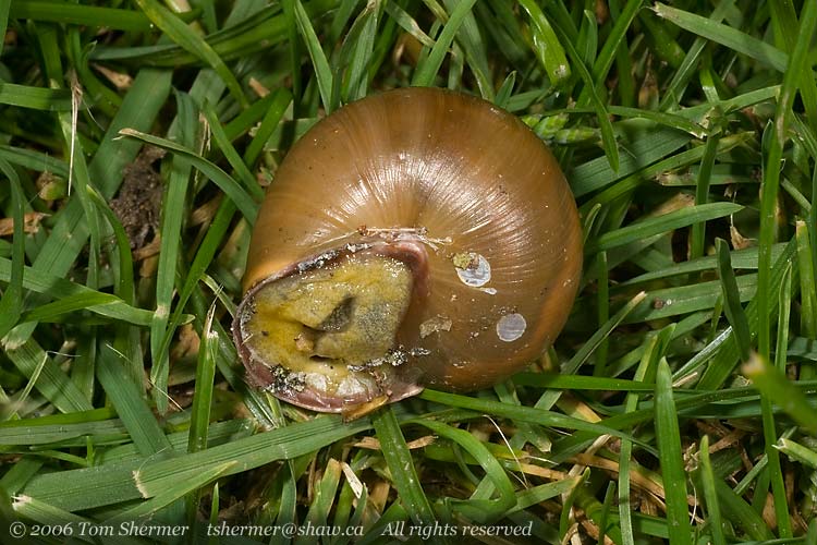 Despite it being the "same old species," it was interesting to see a different-looking one. I was able to get a good picture of the aperture on the shell. Here, the snail is inside, and the yellow stuff is a special spongy protective mucous that is used to seal in moisture and to deter predators. |