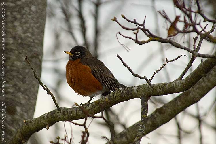After taking just a few shots of the Woolly Bear, I carried on. On the right-hand side of the path, there is a tree that I remember well, because it is where I saw my first Varied Thrush. Sadly, my Varied Thrush friend was predisposed on this day, so he wasn't able to be there in the tree to greet me. However, he was kind enough to send his cousin Robin to do the honors. |