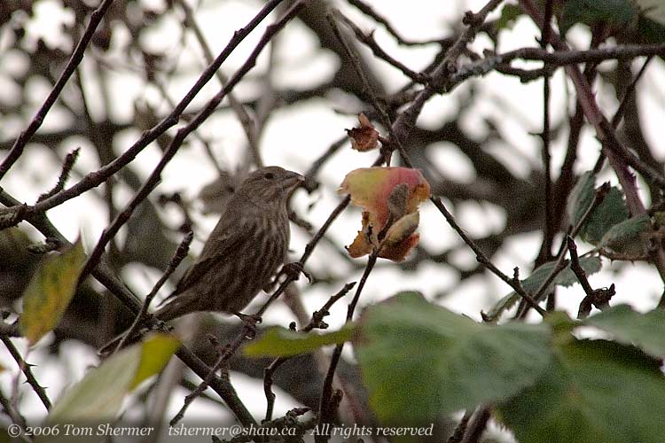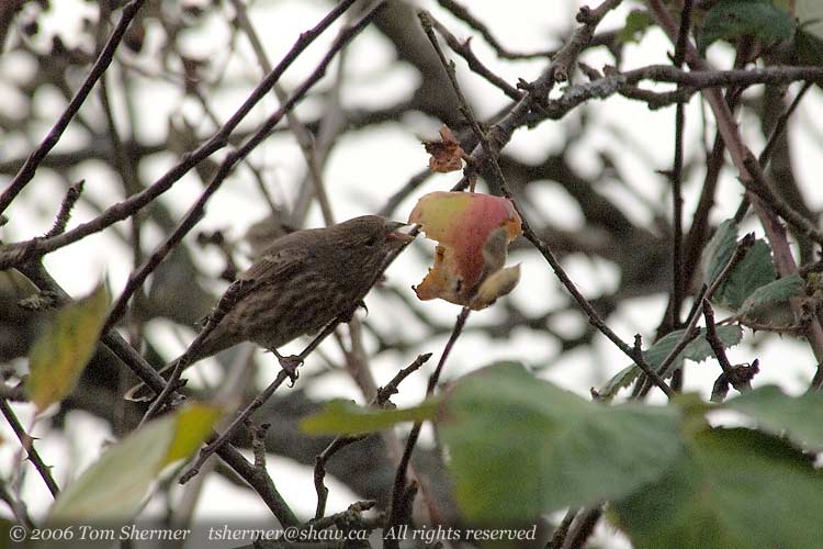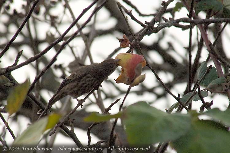 Apparently, I was wrong. Here's a House Finch enjoying the pinnacle of freshness...eating the fruit even before it's been picked. |