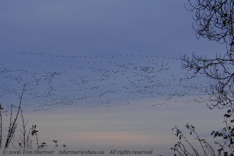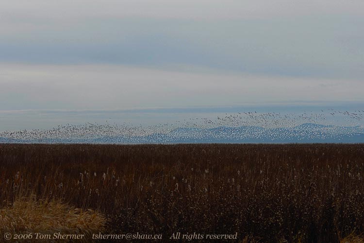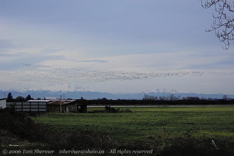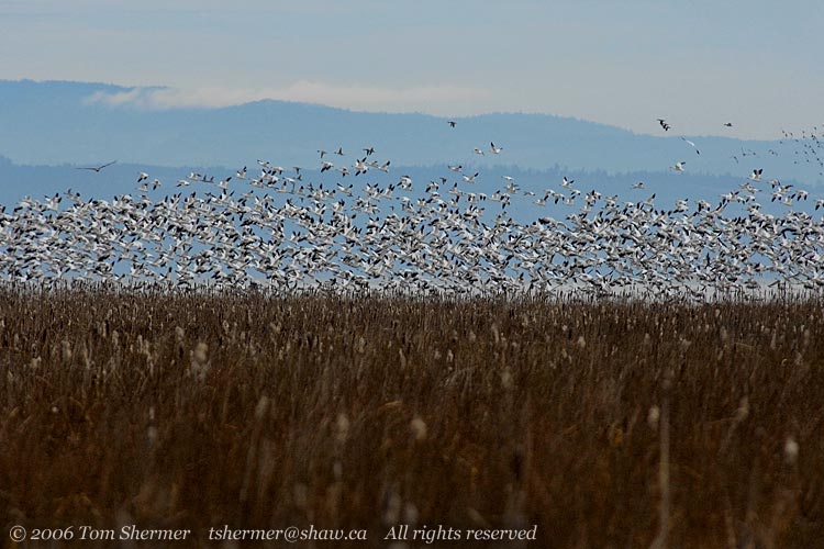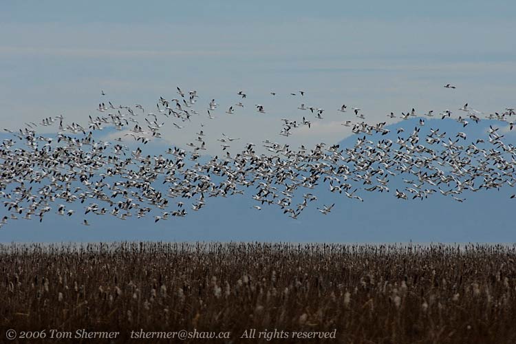 Here's the noisy wedge of fliers. Snow Geese do a little slipstreaming but don't form the rigid formations that are typical of, say, Canada Geese. |