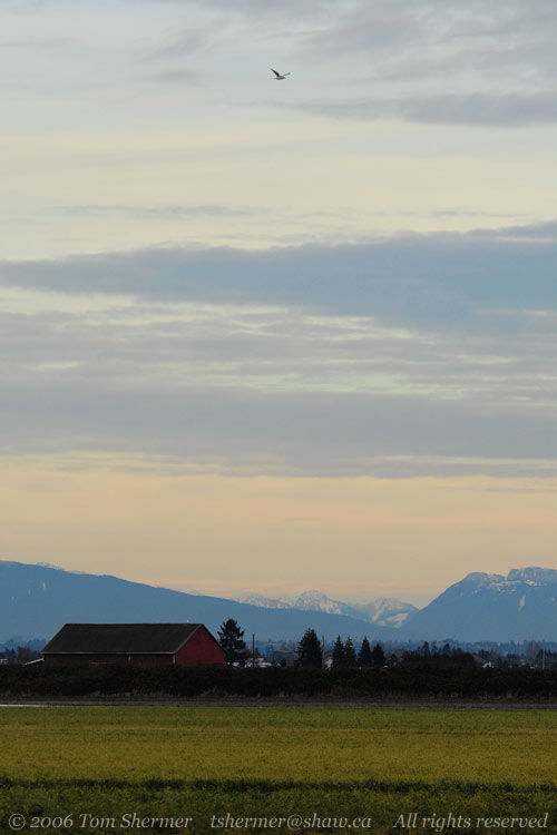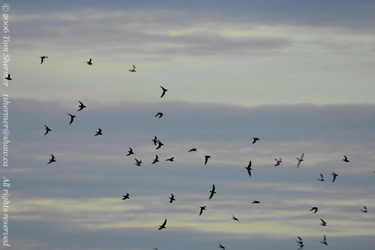 Soon I noticed a small flock of shorebirds racing across the sky above the barns. I raced to get my camera pointed in their direction, and got a couple of shots of their loose formation. |