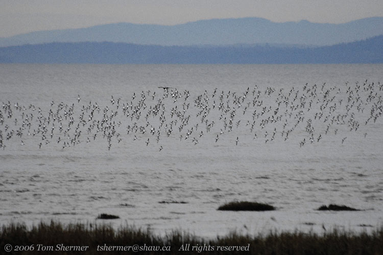 Just when I had decided that I should probably turn around, another eagle came by, scaring up the shorebirds. Apparently the small flock that I had seen had joined many others on the ground, because this flock was considerably larger than the sixty or so that I had seen earlier.