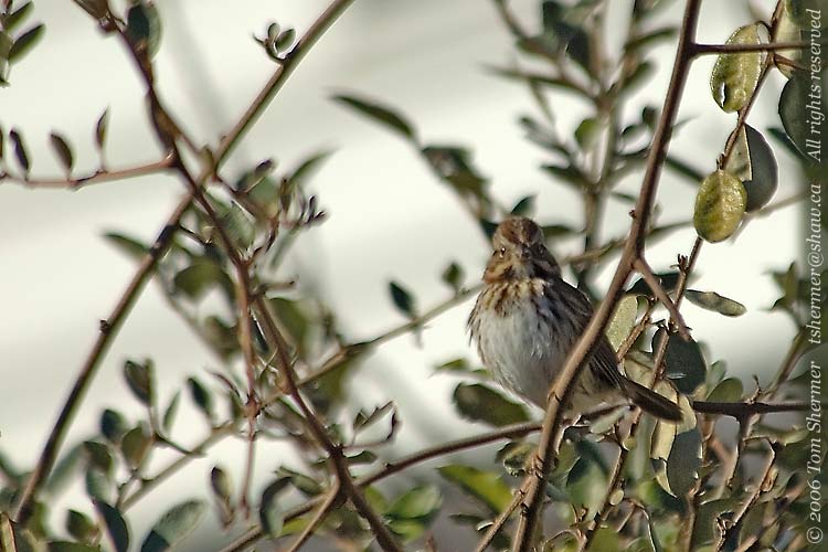 On the 27th, I got up a little before 10am and went outside to check out the late-morning birds. On the side of my brother's backyard, I spotted a bird flitting around in the bushes. It was obviously a sparrow, and it looked like a Song Sparrow. However, when the bird stopped I could see that it had a buffy breast and a similarly-colored stripe under its eye. The streaks on its breast looked fairly orderly. These are characteristics of Lincoln's Sparrow, a close relative of the Song Sparrow. So I identified this as a Lincoln's. |
