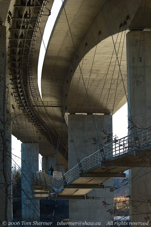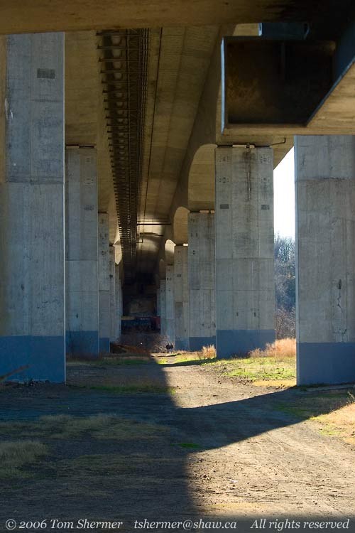 We crossed the bridge, and on the other side, I took some photos of the underside of the car bridge as it continued across the island. |