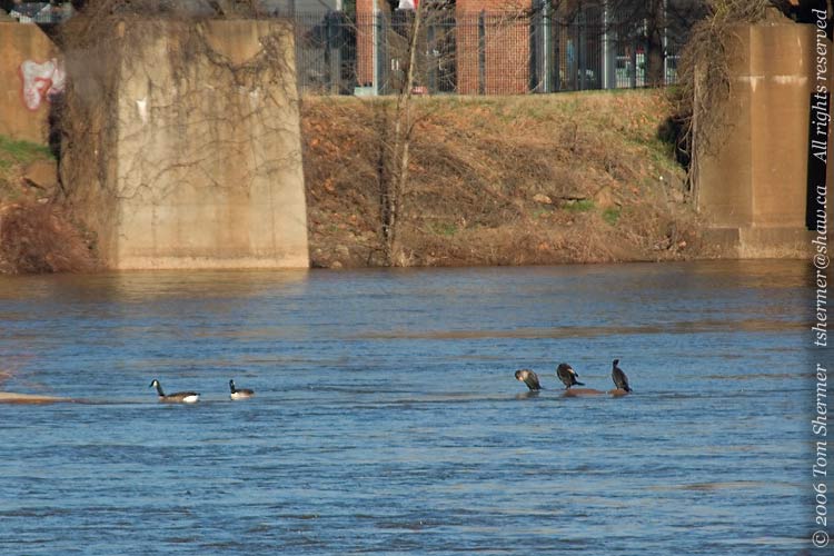 Looking out on the part of the river we had just crossed, I recognized two familiar species of birds—Canada Geese and Double-crested Cormorants. Both of these are abundant from coast to coast. |