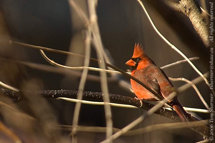The location where the cache was supposed to be turned out to be near a brick wall in some light brambly woods. As the family searched, one of 'em spotted a red fellow watching us, and so I got a decent photo of a male Northern Cardinal. |