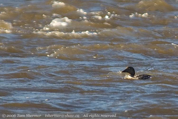 As I watched the river, I noticed a bird out in the rapids, sometimes underwater, sometimes hidden by waves, and sometimes visible. Eventually she surfaced where I could get a good look and some photos. She was a female Common Goldeneye. |