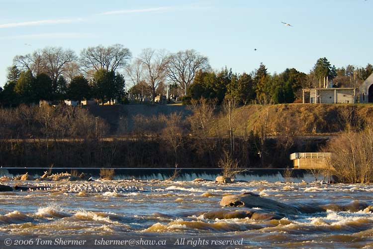 At this end of the island, there is a flat area that looks out onto the rather swift-moving river, and we paused there for a while to enjoy the sight. Looking vaguely upriver, I saw a flock of seagulls perched on some rocks in front of a small dam.