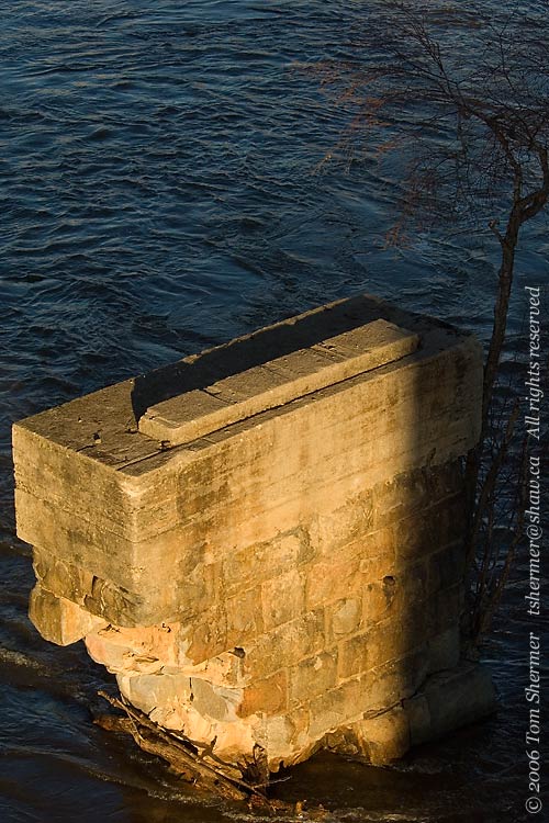 From this point we walked back up the other side of the island, passing a quarry pond with a face above it where rock climbers do their thing. We got back on the hanging footbridge and from there I took a few shots of an old bridge pier in the late-day sun. |