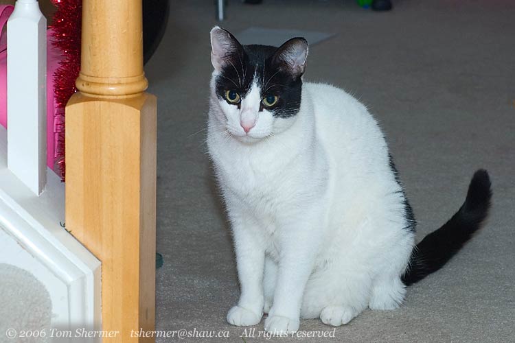 I did take a few more photos later in the evening. My brother's family serves two cats, Mickey and Purrvis, both of whom are adorable but fairly shy. I tried to make friends with both of them but was only successful with the less-shy one, Purrvis. Once we were well-acquainted, I was able to talk him into posing for a couple of photos. Here's the full cat... |