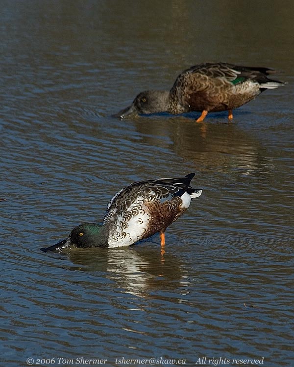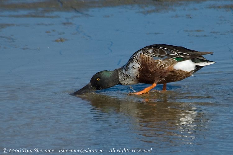 This duck, probing in the shallow water, is a Northern Shoveler. |