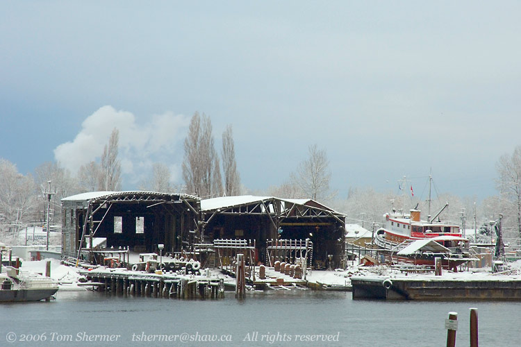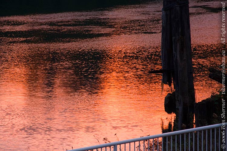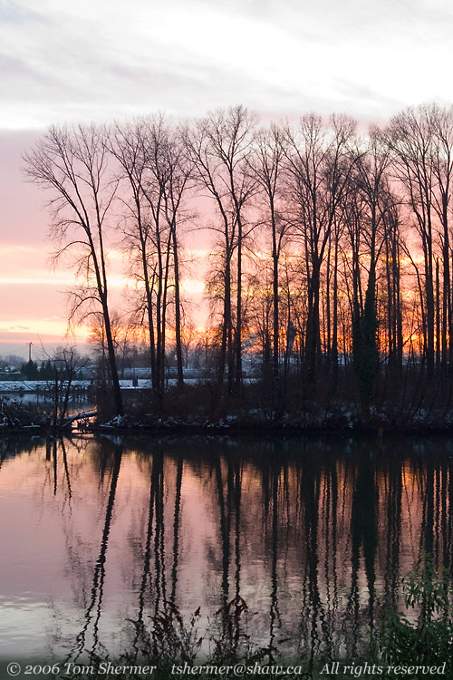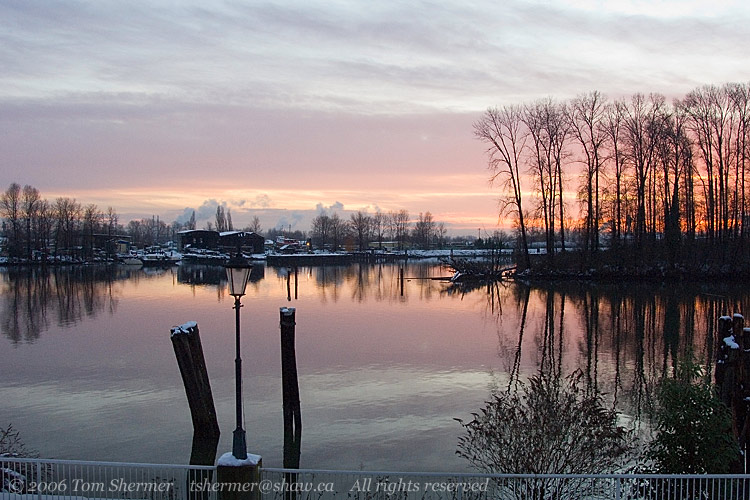 On the 30th, we still had some snow left, and we had a clear colorful sunset. This photo is in about the same direction as the last one, with the boatyard just left of center. |