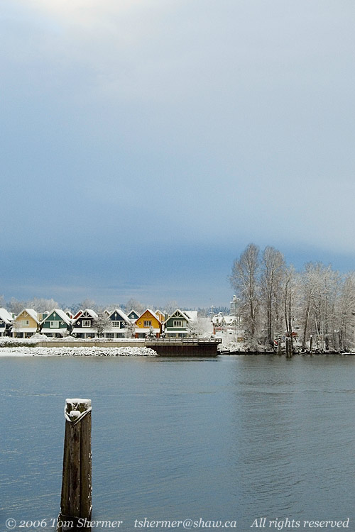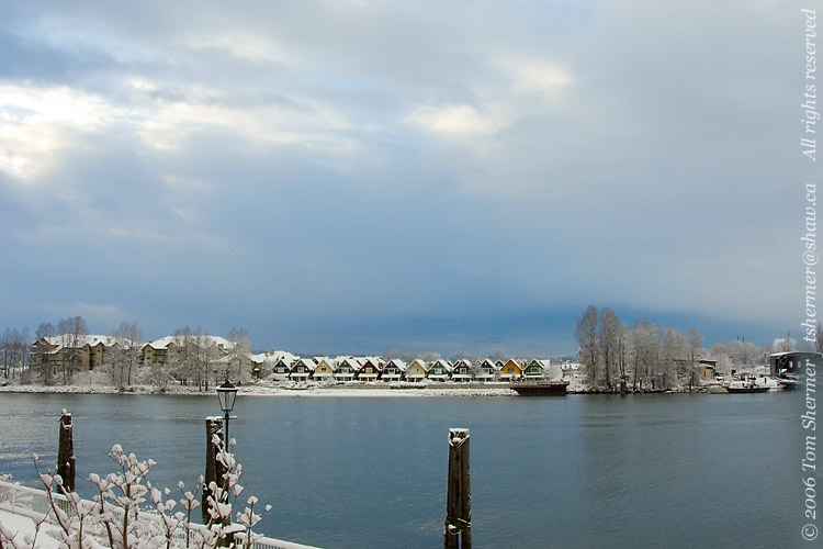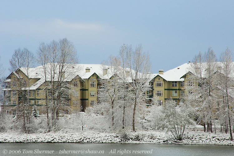 My car accident intervened, along with a few days of photography that became their own entries, and I didn't have any leftovers until a month later on November 27. We had a good fall of snow overnight, but the day came out light and crisp, and I took some landscapes from my balcony. The next three are of houses and condos across the river. |