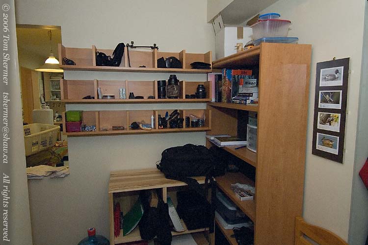 On the 10th of December, I put up three CD shelves in my front entranceway to hold camera equipment. I took this wide-angle snapshot of my newly-well-organized-and-handy camera stuff, so that I could send it out and be the envy of all my photographer friends. I keep thinking about adding a fourth shelf above the others. |